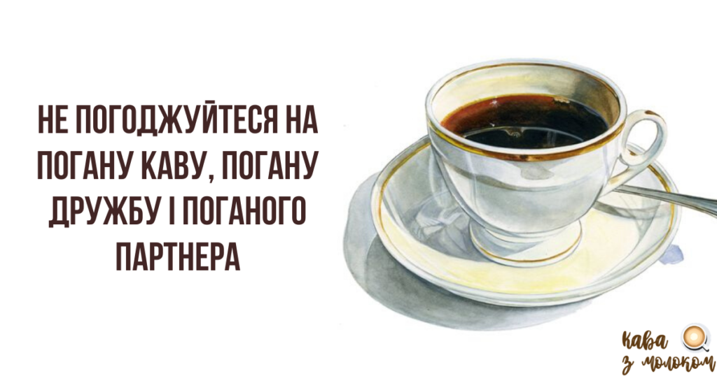 Єдина людина, над якою у вас є контроль, це ви. Ви, і тільки ви, вирішуєте, як вам жити, з ким дружити і кого любити. Тому ніколи не погоджуйтеся пити погану каву. Не погоджуйтеся на поганих друзів, які в скрутну хвилину зрадять. Вони згадують про вас тільки тоді, коли їм щось потрібно. І ніколи не погоджуйтеся на відносини з поганими людьми. Це отруює вас і ваше життя, замість того, щоб надихати і допомагати рости.