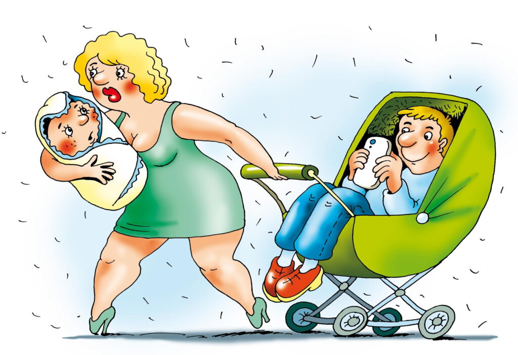 Типовий випадок: паразит відкладає личинку в організм господаря і далі може бути вільним — вирощувати з личинки повноцінну особу господар буде сам. Буквально своєю кров’ю, так. Чоловік-паразит відрізняється від якогось глиста тільки тим, що говорить. А каже він щось на кшталт: «Я не розумію, чому він плаче, ти ж мати, ти це відчуваєш!» Або: «Все, вона вередує, напевно, хоче до тебе». Або: «Звичайно, я займатимуся дитиною, коли моя допомога буде потрібна! Математику з ним робитиму, у футбол навчу грати, битися там…» При цьому дитина в цей самий момент, що характерно, зосереджено забруднює підгузник або засовує в рот брязкальце, і будь-якій розсудливій людині очевидно, що математика, футбол і бійки почнуться років десь за п’ять. Втім, щоденники спостережень за паразитами кажуть нам, що взагалі не почнуться.